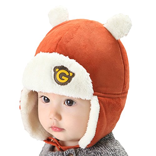 EOZY 冬 子供 ベレー帽子 ニット帽 雷鋒帽 耳あて 可愛い お洒落 お出かけ クマ型 ハット あご紐 赤ちゃん 幼児 あったか 防寒 防風 オレンジ