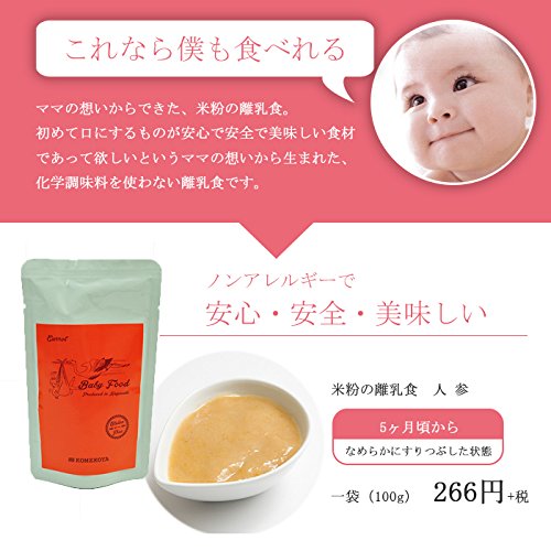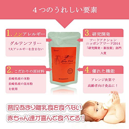 - 長崎県産の米粉、昆布粉、人参を使用したペースト状の離乳食です。