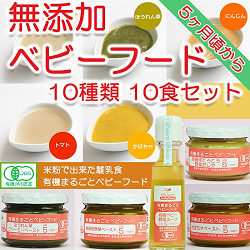 - セット内容:米粉の離乳食5種類:プレーン/トマト/人参/かぼちゃ/ほうれん草/有機JAS認定である国産素材ベビーフード5種類:野菜スープ/ほうれん草クリーミーペースト/有機米とろとろ野菜おじや/緑黄色野菜ペースト/かぼちゃペースト