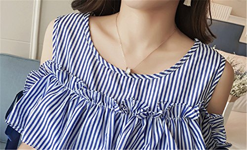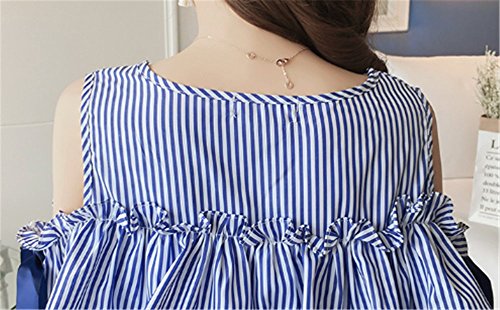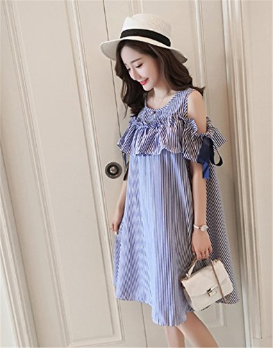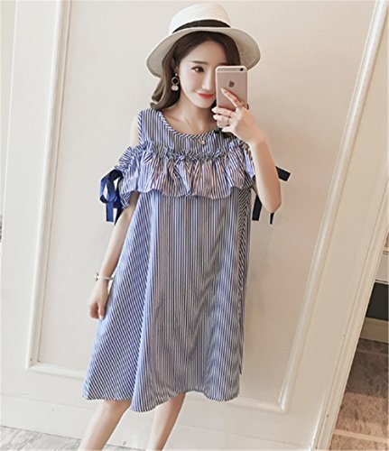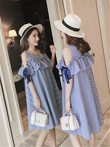 マタニティー 授乳服 ワンピース 妊婦服 スカート レディース 細見え 着痩せ 可愛い リボン 肩出し オフショルダー ストライプ柄 授乳口 半袖 フォーマル 通勤 お宮参り 春夏 M L XL XXL ブルー (M)