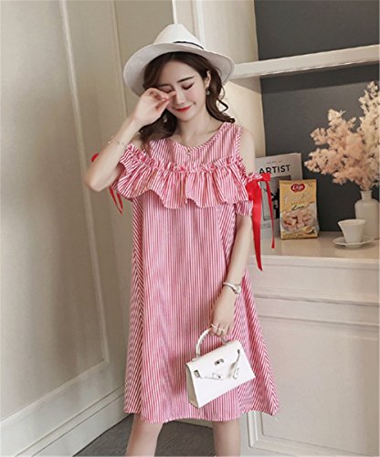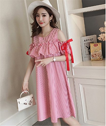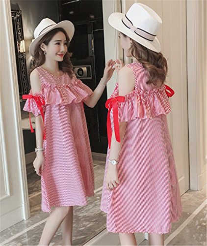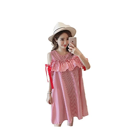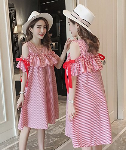 マタニティー 授乳服 ワンピース 妊婦服 スカート レディース 細見え 着痩せ 可愛い リボン 肩出し オフショルダー ストライプ柄 授乳口 半袖 フォーマル 通勤 お宮参り 春夏 M L XL XXL (XL, 赤)
