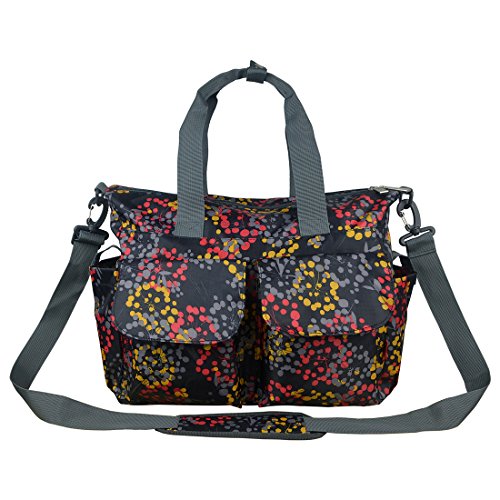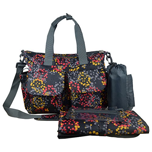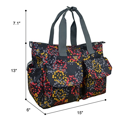 Dimension: 15L x 6W x 13H, Changing Pad Sides: 25.3L x 21.5W, 100% polyester;4 Pieces Set: Diaper Tote Bag + Changing Pad + Transparent Wet/Dry Bag + Insulated Bottle Bag;2 stroller hooks make you hang neatly on a stroller for on-the-go convenience;Multiple inside and outside pockets keep you well-organized;A cushioned changing pad makes your baby more comfortable