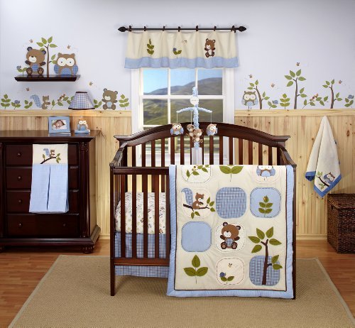 Owl Creek 4 piece comforter set includes the comforter, fitted sheet, dust ruffle, diaper stacker;Made from 100% cotton (exclusive of decoration) and 100% polyester fill;Easy care, machine wash warm with like colors, use non-chlorine bleach only when needed, tumble dry low heat, warm iron if desired