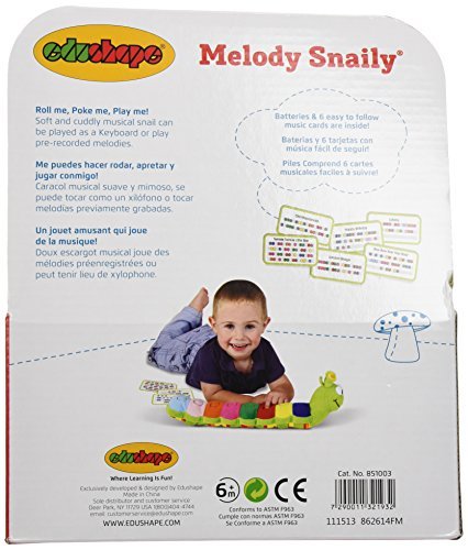 This soft plush roll up musical snail offers 8 musical note chips for enhancing the discovery of sound. Baby products by Edushape will enable babies to: explore, discover, visualize, and verbalize and so much more. At Edushape we encourage you to, touch with passion, laugh with love, and "bond with your baby". Most of all have fun learning together.
