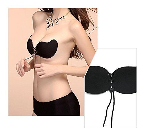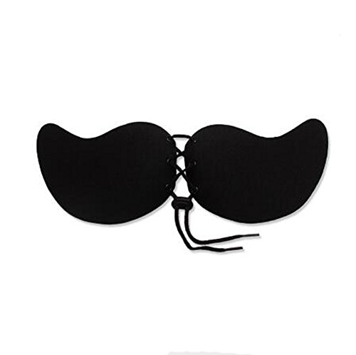 再利用可能なセクシーなマンゴーシェイプ自己接着性ストラップレスシリコンブラジャー深いV型バックレス胸パッドインビジブルプッシュアップブラジャーレディー&レディスガールズのフロントクロージャー付きステイコードNubra (キャップD, ブラック)