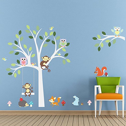 ElecMotive Cartoon Forest Animal Monkey Owls Fox Rabbits Hedgehog Tree Swing Nursery Wall Stickers Wall Murals DIY Posters Vinyl Removable Art Wall Decals for Kids Girls Room Decoration (Monkey Owls) by ElecMotive