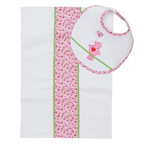 Set includes 1 baby bib and 1 burp cloth;Both items are 100% cotton and machine washable for multiple uses and easy care;Makes a great baby shower gift for any new mom