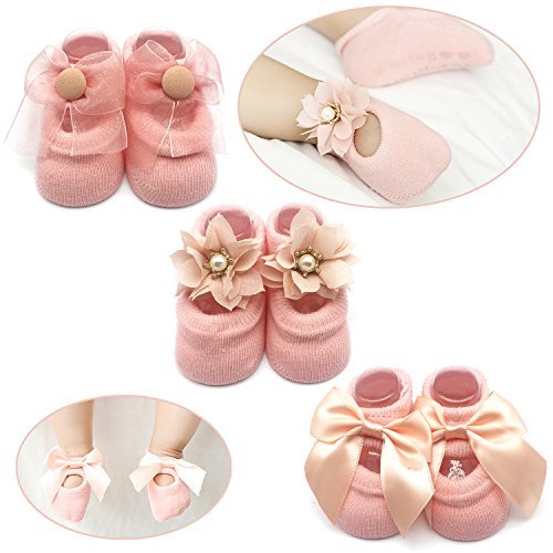 Elesa Miracle 滑り止め 赤ちゃん 女の子 幼児用 メアリージェーンソックス 新生児 写真撮影小道具 アンチスリップ フラワー パール Bownoteソックス バリューセット ギフトボックス S for 0-6 Months ピンク 4327890866