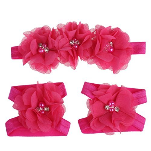 Elevin(TM) HOT Baby Girl's Kids Colorful Foot Flower Barefoot Sandals + Headband Set (Hot Pink)