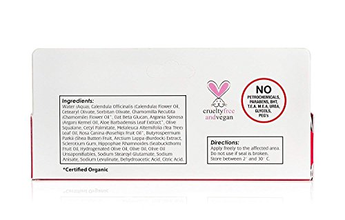 - カモミールとカレンデュラのフラワーオイル、ビタミンE、オートバイプレバイオティクス、アロエ葉エキス、アルゴン、シーソウソウオイルを含む99%植物由来軟膏。酸化亜鉛、アルコール、石油は含まれていません。 非脂っこい。 速乾性と深い保湿。