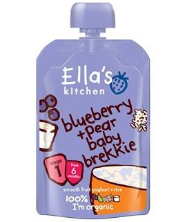 Blueberry and pear purees, natural yoghurt and wholegrain rice.