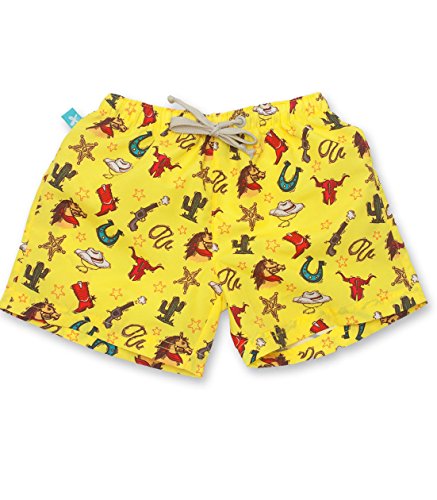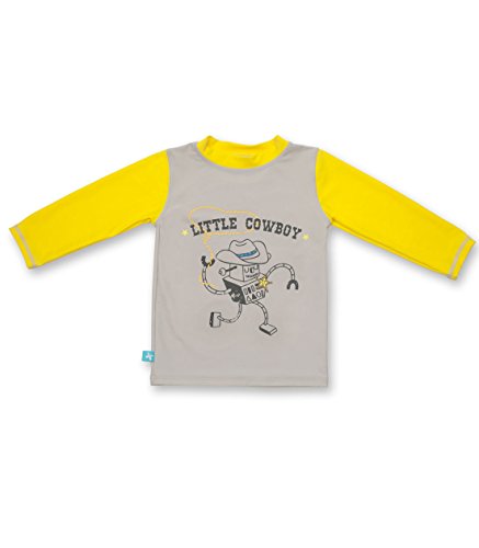 ロボット風のカウボーイがかわいいラッシュガードとカウボーイ色のイラストがいっぱい元気な黄色のパンツ、2点せっとです。パンツはメッシュガード付。 公園での水遊びにもピッタリです。
