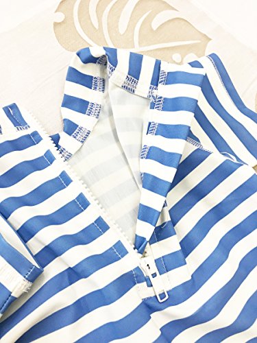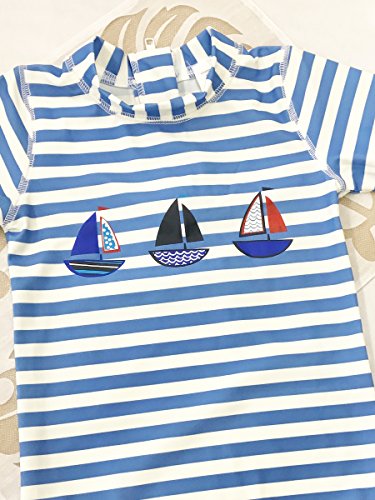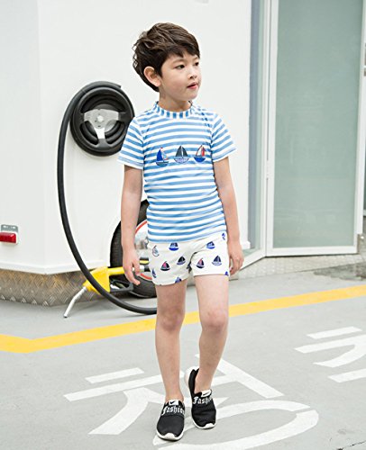 Emfay 子供 男の子 水着 半袖 ボーダー柄 上下セット キャップ付き ラッシュガード スイムウェア 紫外線 UVカット 8T