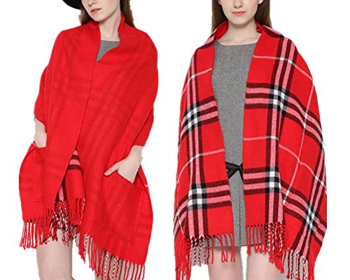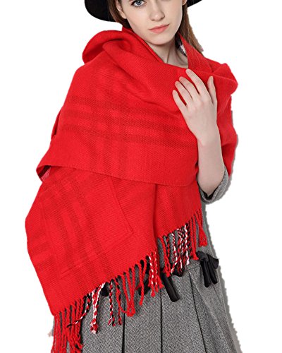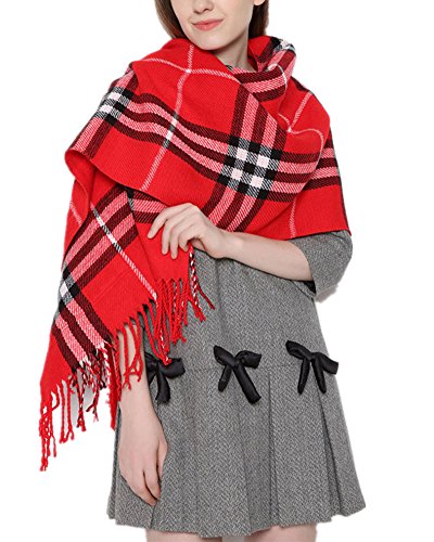Emoyi マフラー 大判 ストール ロングマフラー チェック マフラー フリンジ メンズ レディース 男女 兼用 (赤)