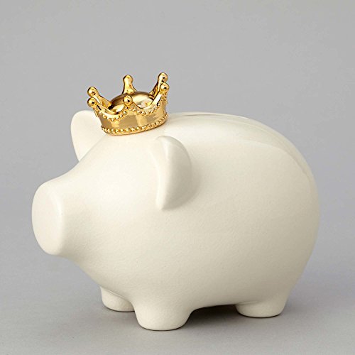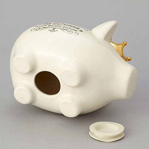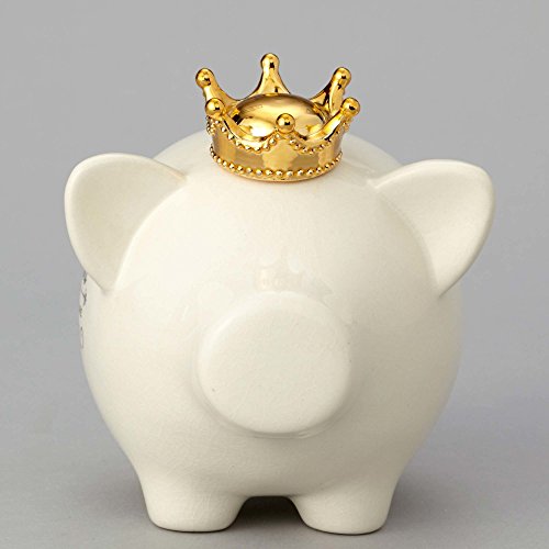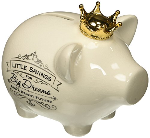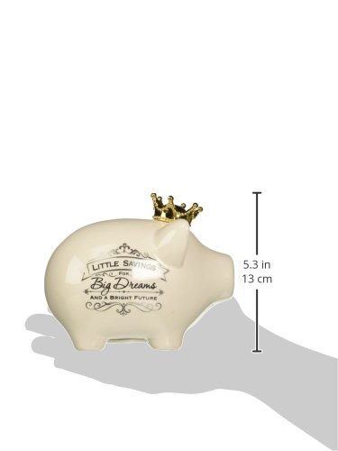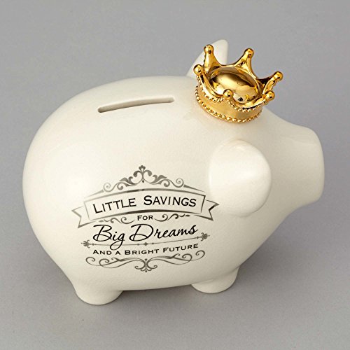 Adorable piggy bank made of durable high quality stoneware;Piggy wears a crown and intricate detail on the side reads Little Savings for Big Dreams and a Bright Future;Packaged in a lovely lined gift box perfect for sending your love when you can't be there;Great for newborns and children of all ages;Measures 4 in H x 6 in L