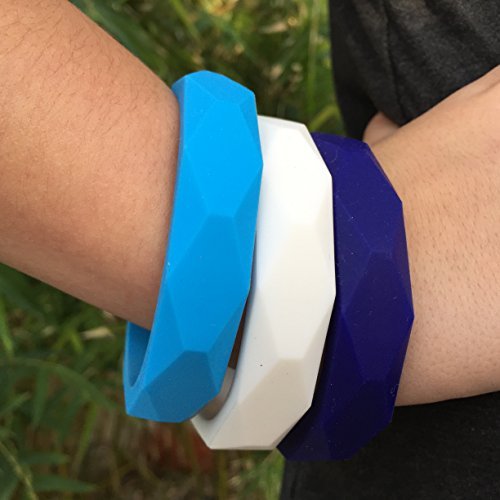 Silicone teething bracelets are a set of three pretty bangles that moms can wear to help their babies through teething pain. When your baby is feeling bitey these bracelets will be in reach to be chewed on and relieve oral pain by providing gentle pressure on the gums. You won't have to worry about your child dropping a pacifier or teething ring on the dirty ground and picking up germs.