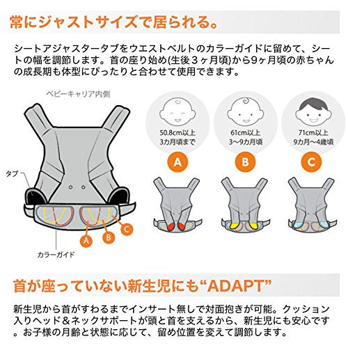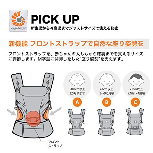 赤ちゃんの成長にADAPTするエルゴベビー・ベビーキャリア ■ 商品説明 対面抱き、腰抱き、おんぶの抱き方でご使用いただけます。 エルゴノミックポジション・シートが新生児か幼児(3.2kg~20kg)までの成長に合わせて調節ができます。 クロス装着も可能な肩ストラップと、腰サポート付きウエストベルトが赤ちゃんの荷重を分散。長い時間の使用でも快適です。 クッション入りネック&ヘッドサポートが頭と首を支えます。 ■ スリーピングフード 首カックンのサポートや、日除けにスリーピングフード ※開封後のご返品につきましては、承ることができかねます。 【素材】 ベビーキャリア本体:内生地・外生地:綿100% ベビーウエストベルト:ポリエステル100% 【対象】 月齢0ヶ月~48ヶ月サイズウエスト回り132cmまで 【原産国】ベトナム 【付属品】INSTRUCTION MANUAL、取扱説明書、保証カード、ベビーウエストベルト