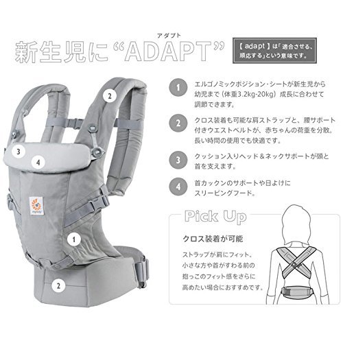 赤ちゃんの成長にADAPTするエルゴベビー・ベビーキャリア ■ 商品説明 対面抱き、腰抱き、おんぶの抱き方でご使用いただけます。 エルゴノミックポジション・シートが新生児か幼児(3.2kg~20kg)までの成長に合わせて調節ができます。 クロス装着も可能な肩ストラップと、腰サポート付きウエストベルトが赤ちゃんの荷重を分散。長い時間の使用でも快適です。 クッション入りネック&ヘッドサポートが頭と首を支えます。 ■ スリーピングフード 首カックンのサポートや、日除けにスリーピングフード ※開封後のご返品につきましては、承ることができかねます。 【素材】 ベビーキャリア本体:内生地・外生地:綿100% ベビーウエストベルト:ポリエステル100% 【対象】 月齢0ヶ月~48ヶ月サイズウエスト回り132cmまで 【原産国】ベトナム 【付属品】INSTRUCTION MANUAL、取扱説明書、保証カード、ベビーウエストベルト