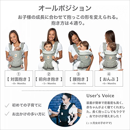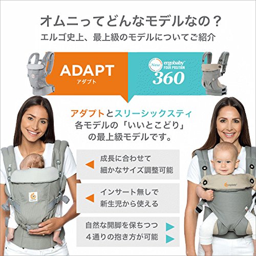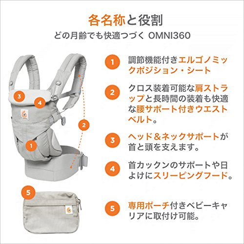 2017秋最新エルゴベビー!親子の快適性No.1、新生児から使えるOMNI! 【4ポジション】【OMNI 360(オムニ スリーシックスティ)】 抱き方:4ポジション ○対面抱き ○腰抱き ○おんぶ ○前向き抱き [特徴] ○ エルゴノミックポジション・シートが新生児か幼児(3.2kg~15kg)までの成長に合わせて調節ができます。 ○ クロス装着も可能な肩ストラップと、腰サポート付きウエストベルトが赤ちゃんの荷重を分散。長時間の使用でも快適です。 ○ クッション入りのネック&ヘッドサポートが、頭と首を支えます。 ○ スリーピングフード 首カックンのサポートや、日除けにスリーピングフード サイズ 腰回り約60~132cmまで 原産国 ベトナム 材質 ベビーキャリア本体:綿100%・ベビーウエストベルト:ポリエステル100% ポーチ 表面同色 サイズ(H12×W16×D3.5cm) 付属品 ベビーウエストベルト、専用ポーチ、ベビーキャリア保証カード、取扱説明書(日本語)