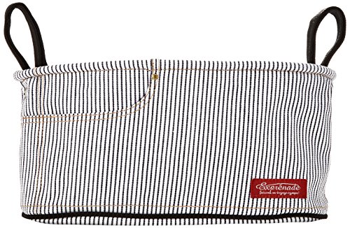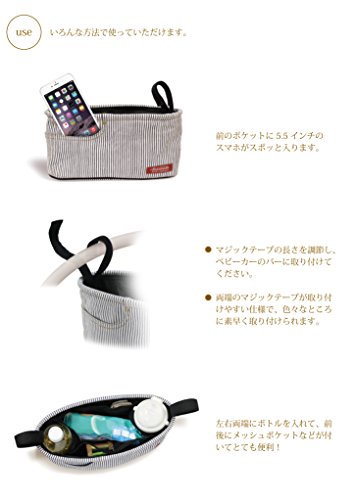 「Exprenade ストローラーオーガナイザー ホワイトヒッコリー」は、ベビーのお気に入りのおもちゃ・水筒・お菓子をさっと入れて、使いたい時に取り出しが簡単なベビーカー用ポーチです。前のポケットに5.5インチのスマートフォンがすっぽりはいります。 使用方法 ベビーカー、車のヘッドレスト等にマジックテープを巻きつけてご使用ください。 素材 本体:綿、ポリエステル、レーヨン、その他