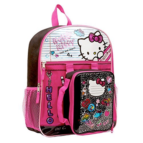 She'll enjoy back to school with her Hello Kitty backpack and lunch tote bag. Bright purple, pink, black and rainbow colors with cute and smart school design. The large compartment will keep her school books or travel accessories safe. The detachable lunch kit bag is insulated to keep food fresh and cold. A fun book bag to carry her Hello Kitty dolls and toys. For girls ages 3 and up.