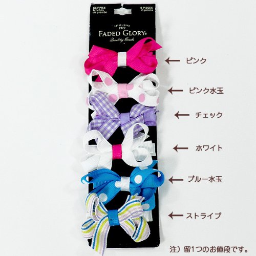 【アメリカ買い付け商品】 FADED GLORY リボンクリップ留め・髪飾り ヘアアクセサリー ※留1つのお値段です。 サイズ:長さ:5.0cm カラー:ピンク・ピンク水玉・チェック ホワイト・ブルー水玉・ストライプ 仕入国 アメリカ 生産国 中国
