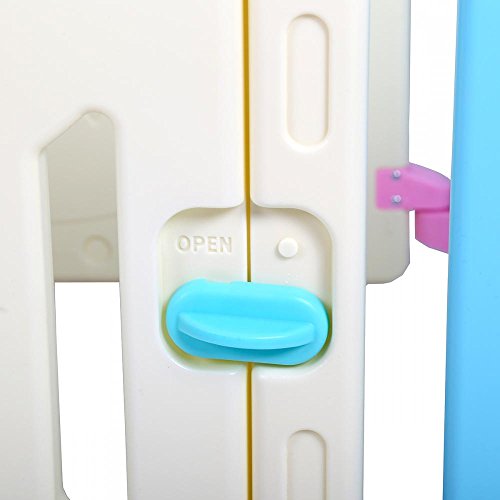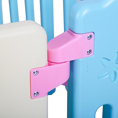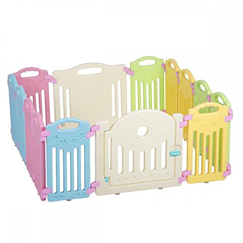 Perfect for baby and children up to 4 years of age;Ctivity board: picture house, play phone, spinning balls Material: PE;Individual Panels: 16 2/5 L x 23.5 H Door and game panel: 31 L x 23.5 H;14 Panels that are interchangeable to increase or decrease playpen size or shape;Adjustable size and shape ; Door with safety lock
