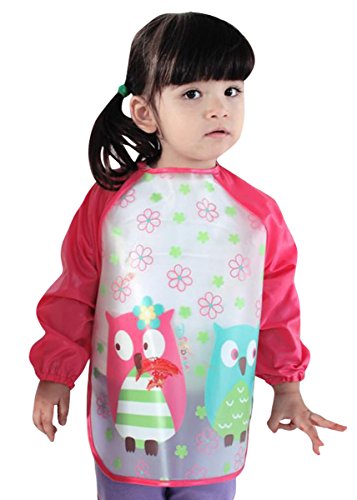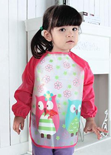 超可愛い お食事用 エプロン 長袖 ベビー用 子供用 幼児用 スモック ビブ 防水 絵画 防汚 幼稚園 保育園 レッド フクロウ