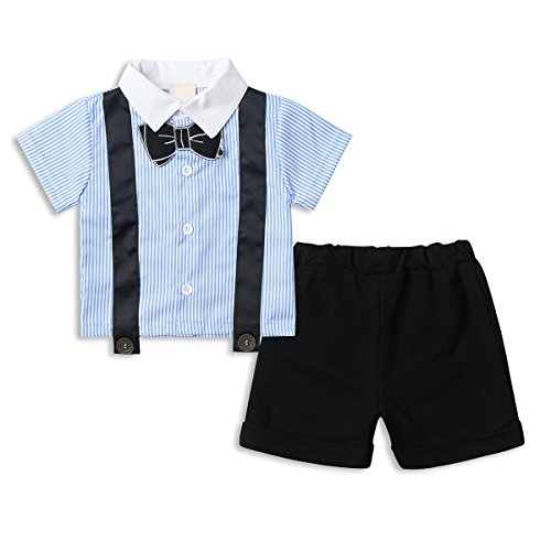 ベビー ボーイズ 半袖 フォーマル スーツ 男の子 上下 2点 セット ネクタイ サスペンダー 子供服 七五三 結婚式 発表会 (90, ブルー)