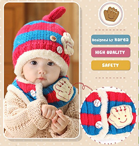 FIRE START 選べる4色 ニット帽子&マフラー セット耳まであったかキャップ ベビー キッズ 子供用 ニットキャップかわいい 赤ちゃんニット帽誕生日 出産祝い 記念写真の衣装にベビー 防寒帽子 (ローズ+青色)