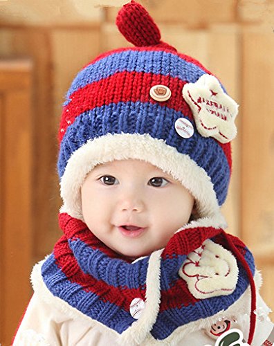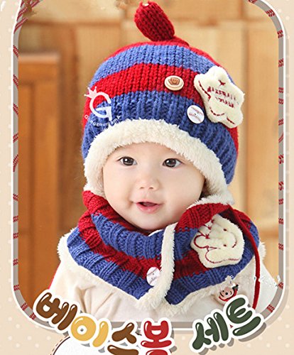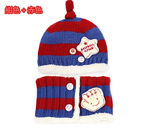 FIRE START 選べる4色 ニット帽子&マフラー セット耳まであったかキャップ ベビー キッズ 子供用 ニットキャップかわいい 赤ちゃんニット帽誕生日 出産祝い 記念写真の衣装にベビー 防寒帽子 (レッド+紺色)