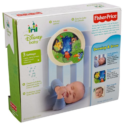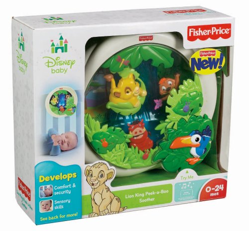 The new Lion King Soother is sure to calm and soothe baby to sleep with 3 moving characters, agentle glowing waterfall and up to 18 minutes of gentle music! Baby will enjoy watching Simba moveback and forth on a leaf while Timon plays peek-a-boo among the foliage, and Pumbaa glides along thewaterfall. Mom can choose between lights, motion & music, lights & music, and music only. Music will include sound affects and a recognizable tune from the Lion King movie! Zazu acts as an activation button so even baby can start the fun.