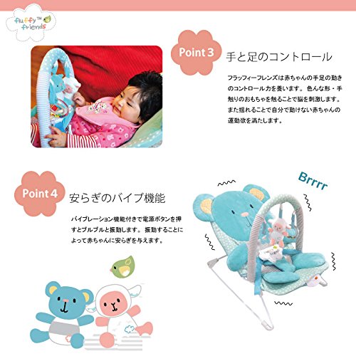 かわいいくまさんともこもこひつじさんのフラッフィーフレンズのバウンサー。ラトルやおもちゃでベビーも楽しくごきげん。脳の刺激にも良いですよ。電池でぶるぶると振動モードもあります。出産祝いにも喜ばれます。