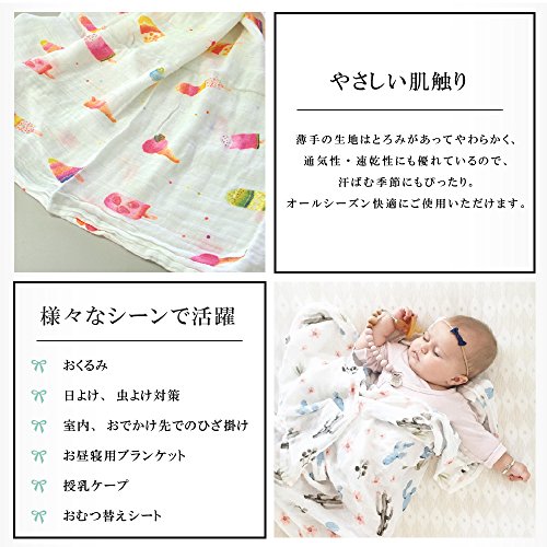 - 【使い方いろいろ】おくるみ / ベビーカーや抱っこ紐の日よけ/エアコンの効いたレストランや車内でのひざ掛け/お昼寝時のブランケット/授乳ケープ