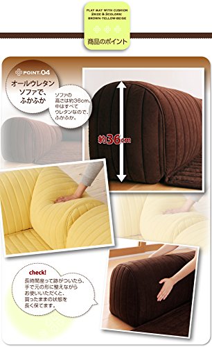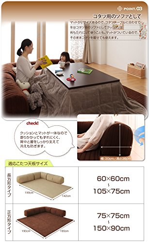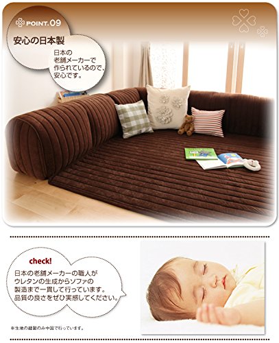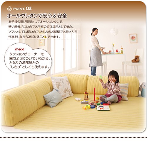 Point1:ふわふわクッション+プレイマットで空間広々 リビングルームのメインソファにロースタイルのソファとマットが一緒だから、圧迫感がなくお部屋の空間が広くみえます。 Pint2:オールウレタンで安心&安全 お子様の遊び場としてオールウレタンで、硬い部分がないのでお子様の遊び場として安心。ソファとしては低いので、となりのお部屋でお母さんが仕事をしながら遊ばせることもできます。 check!クッションがコーナーと囲むようについているから、隣のお部屋との“しきり”としても使えます。 Point3:コタツ用のソファとして マットが2サイズあるので、コタツテーブルに合わせて冬はコタツ用のソファとしてクッションを背もたれにして使うことも。マットがついているので、そのままコタツを載せても使えます。