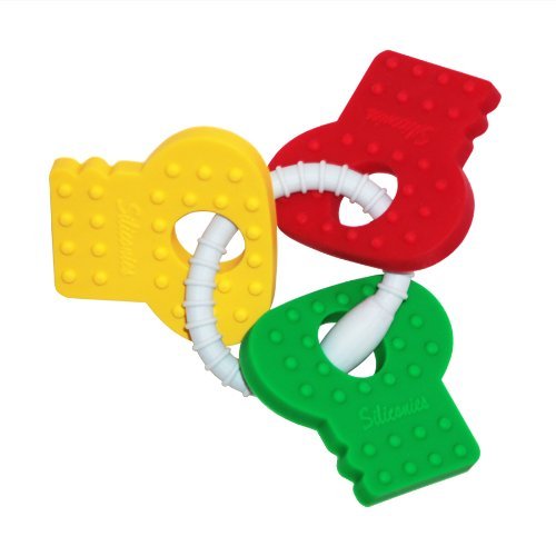 Siliconies Teething Keys are the first independent teether to be launched by Family Bedrock. Their teething/nursing necklaces have gained popularity for the attractive designs, functionality, and as the first teething jewelry to add sensory textures. With these same ideas in mind, the Siliconies Teething Keys were created. Each teething ring consists of 3 chunky silicone keys with multiple textures. Each key is 0.25" thick and 2.25" high. A silicone ring with 2.25" diameter strings the keys together with another unique texture. Easy for little hands to hold, this teething ring is fun, functional, and stimulating. The non-toxic silicone creates the perfect teething material that will feel great on little gums.
