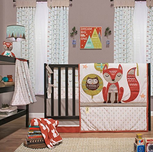 Clever Fox 4 Piece Set includes embroidered quilt, dust ruffle, fitted crib sheet, and diaper stacker; all fabrics are 100% jersey knit cotton, providing an especially soft feel for your baby, 100% jersey knit cotton fabrics will make the 30 by 40 inch quilt your baby's favorite tummy-time blanket; the intricate embroidered appliques provides interesting textures for her to explore, The fitted crib sheet, also of 100% cotton, has all-around elastic and deep pockets so that it will fit safely and securely every time to a standard 52 by 28 inch crib mattress, Extra-long crib skirt, featuring a full 17 inch drop, will assure that your crib looks fully "dressed" even when the mattress is at its highest setting; beautiful colors of tan and burnt orange are perfectly highlighted by a subtle blue and white print, Beautiful modern design incorporates creative geometric patterns within the contemporary woodland creatures to yield a truly stunning look