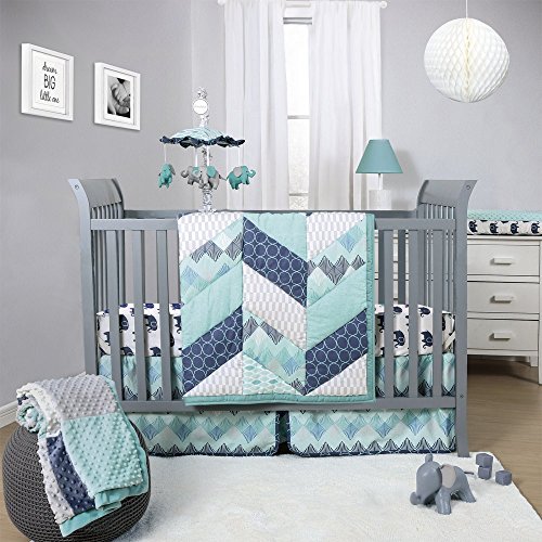 The Peanut Shell Mosaic Nursery Collection features a tailored contemporary design with a combination of unique graphic prints using 100% cotton fabrics; 3 piece set includes: quilt, dust ruffle, and fitted sheet;Quilt, generously sized at 44 by 37 inches, is made of 100% cotton fabrics featuring a pieced herringbone quilting design with geometric and tile prints in teal, grey, aqua, and marine blue; will find a multitude of uses in and out of the nursery;Dust ruffle, with a unique chevron design and decorative center pleat, is finished with a marine blue print border and has a generous 16 inch drop;100% cotton sateen fitted crib sheet fits a standard crib mattress that measures 28 x 52; cute elephants add the perfect touch of whimsy;Machine wash and dry
