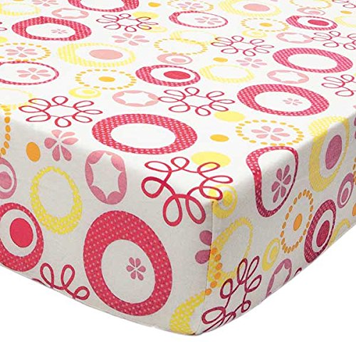 100% natural cotton fitted crib sheet is designed to fit a standard crib mattress measuring 28 by 52 inches;Fully elasticized to assure a safe and secure fit every time while making frequent sheet changes easier;Unique design features cool and contemporary graphic designs in bright shades of red, pink, and yellow; sure to brighten up your little girl's nursery;Constructed to assure maximum ease of care, will get softer wash after wash and retain its vibrant colors;Coordinates with all items from the Sunshine Nursery Separates Collection by True Baby