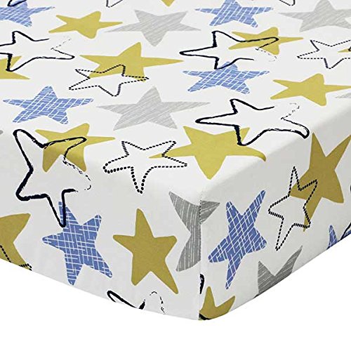 Made from 100% cotton fabrics; machine wash and dry;Fitted sheet is fully elasticized to fit all standard sized 52 by 28 inch cib mattresses;Features a contemporary star print in yellow gold, purple, and grey on a white background;Coordinates with the Stargazer Crib Bedding Collection by Peanut Shell