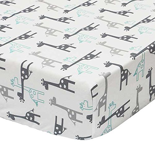 Made from 100% cotton fabrics; machine wash and dry;Fitted sheet is fully elasticized to fit all standard sized 52 by 28 inch cib mattresses;Unique print with grey and minty aqua contemporary giraffe designs on a white background;Coordinates with the Uptown Giraffe Crib Bedding Collection by Peanut Shell