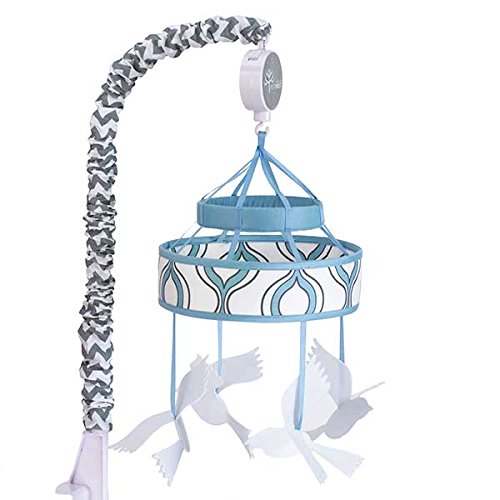 Musical mobile features dimensional white birds and blue and gray graphic prints;Plays Brahm's Lullaby to gently sothe your baby to sleep;Encourages visual, auditory, and motor development;Attaches to a standard sized crib;Coordinates with all items from the Henri Crib Bedding Collection