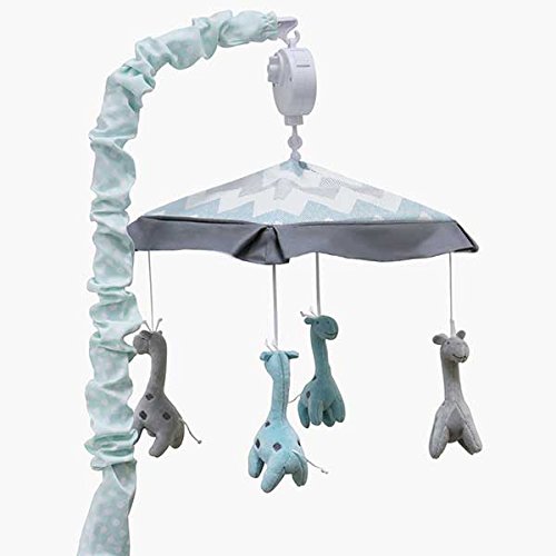 Mobile features adorable plush giraffes in aqua and grey under a chevron canopy;Gently soothe your little one to sleep with this wind up mobile; no batteries necessary;Promotes auditory and motor development and provides visual stimulation;Coordinates with the Uptown Giraffe Crib Bedding Collection by Peanut Shell