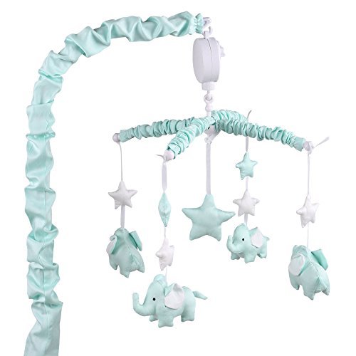 This adorable musical mobile from The Peanut Shell features sweet elephants in mint and fluffy white clouds;It plays a gentle lullaby to soothe your baby to sleep;Designed to fit standard cribs; spot clean;Promotes auditory, motor development, visual stimulation;Wind up operation means no batteries are required; easy assembly instructions included