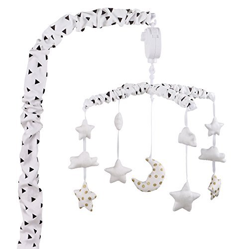 This adorable musical mobile from The Peanut Shell features beautiful gold stars and fluffy white clouds;It plays a gentle lullaby to soothe your baby to sleep;Designed to fit standard cribs; spot clean;Promotes auditory, motor development, visual stimulation;Wind up operation means no batteries are required; easy assembly instructions included