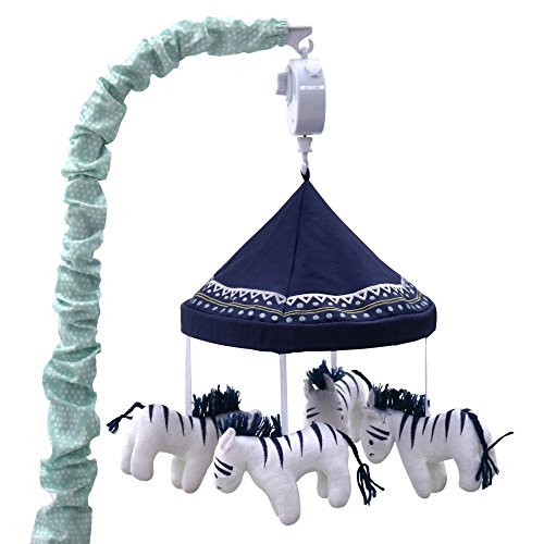 This adorable Peanut Shell musical mobile features zebras under a decorative navy blue canopy with a mint green arm;It plays a gentle lullaby to soothe your baby to sleep;Designed to fit standard cribs; spot clean;Promotes auditory, motor development, visual stimulation;Wind up operation means no batteries are required; easy assembly instructions included