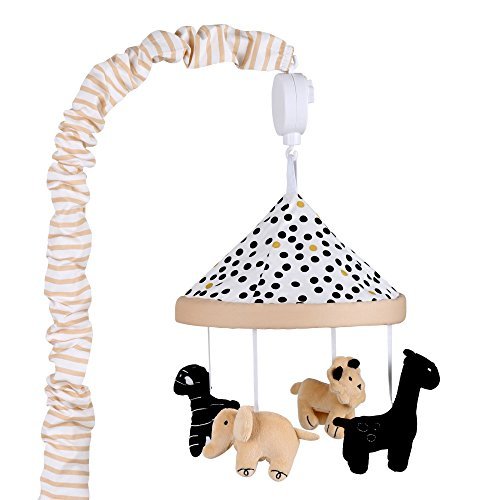 This adorable musical mobile from The Peanut Shell features cute jungle animals under a contemporary dot canopy;It plays a gentle lullaby to soothe your baby to sleep;Designed to fit standard cribs; spot clean;Promotes auditory, motor development, visual stimulation;Wind up operation means no batteries are required; easy assembly instructions included