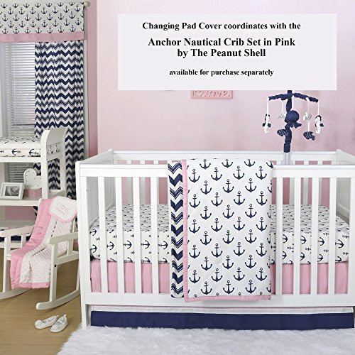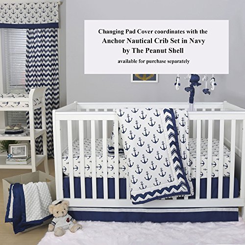 This Peanut Shell changing pad cover features a contemporary nautical print in navy and white;Fabric is 100% cotton sateen, a weave that results in a bright satin-like appearance and feel, providing the optimal mix of durability, beauty, breathability, and ease of care; machine wash and dry;Includes buttonholes on the sides to accommodate changing pads with straps and buckles to keep baby safe and secure;All-around elastic assures a perfect fit to standard contoured changing pads measuring 32 inches by 16 inches by 5.5 inches;Coordinating crib bedding, window treatments and other accessories are available from The Peanut Shell to create your perfect nursery