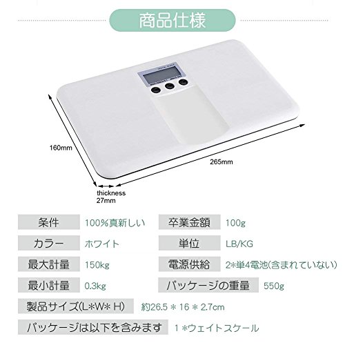 - 【商品仕様】条件:100%真新しい。カラー:ホワイト。最大計量:150kg。最小計量:0.3kg。卒業金額:100g。単位:LB / KG。電源供給:2 *単4電池(含まれていない)。製品サイズ(L * W * H):約26.5 * 16 * 2.7cm 。パッケージの重量:550g。パッケージは以下を含みます:1 *ウェイトスケール。