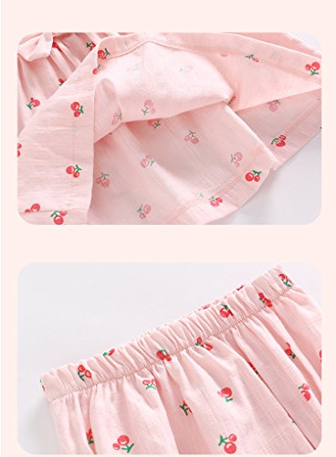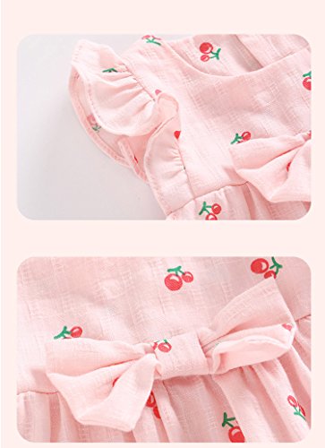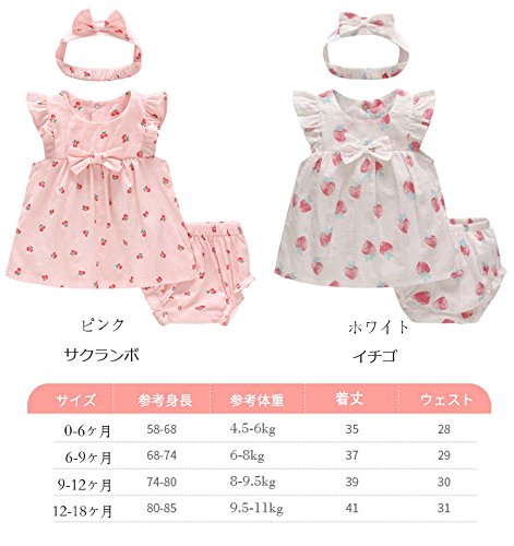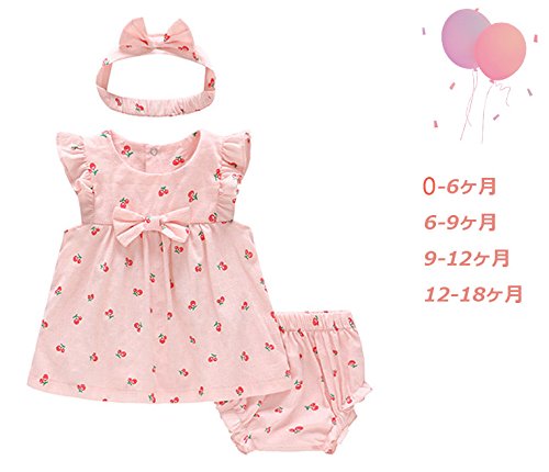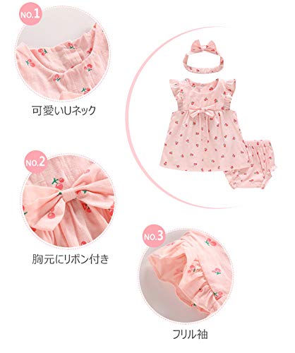 Feidoog ベビー服 ロンパース ショートパンツ ヘアバンド 上下 3点セット 新生児 赤ちゃん 女の子 お姫様 リボン フリル 可愛い おしゃれ ドレス 綿 出産祝い 誕生日 チェリー ピンク サイズ(6-9ヶ月 )